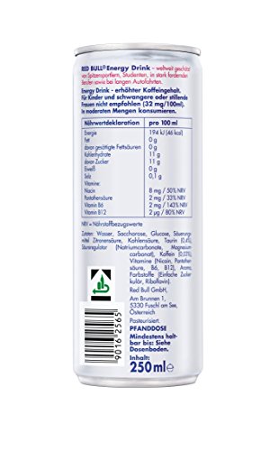 Red Bull Energy Drink beinhaltet hochqualitative Zutaten: Koffein, Taurin, B-Komplex-Vitamine, Saccharose & Glukose, alpines Wasser