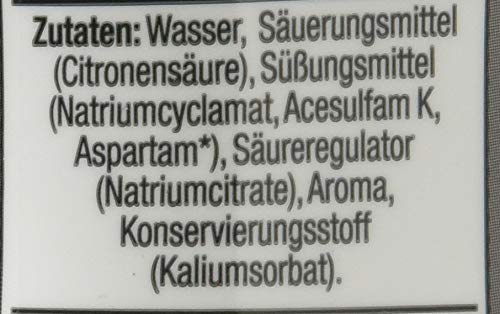 Zutatenliste: Wasser, Säuerungsmittel (Citronensäure), Süßungsmittel (Natriumcyclamat, Acesulfam K, Aspartam*), Säureregulator (Natriumcitrate), Aroma, Konservierungsstoff (Kaliumsorbat). *Enthält eine Phenylalaninquelle.