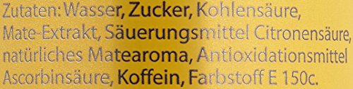 Zutaten: Wasser, Zucker, Kohlensäure,Mate-Extrakt, SäuerungsmittelCitronensäure, natürliches Matearoma,Antioxidationsmittel Ascorbinsäure, Koffein,Farbstoff E 150c