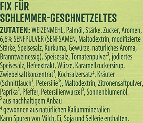 Zutaten: WEIZENMEHL, Palmöl, Stärke, Zucker, Aromen, 6,6% SENFPULVER (SENFSAMEN, Maltodextrin, modifizierte Stärke, Speisesalz, Kurkuma, Gewürze, natürliches Aroma, Branntweinessig), Speisesalz, Tomatenpulver³, jodiertes Speisesalz, Hefeextrakt, Würze, Karamellzuc kersirup, Zwiebelsaftkonzentrat³, Kochsalzersatz4, Kräuter (Schnittlauch³, Petersilie³), Maltodextrin, Zitronensaftpulver, Paprika³, Pfeffer, Petersilienwurzel³, Sonnenblumenöl. ³ aus nachhaltigem Anbau 4 gewonnen aus natürlichen Kaliummineralien Kann Spuren von Milch, Ei, Soja und Sellerie enthalten.