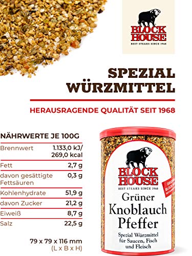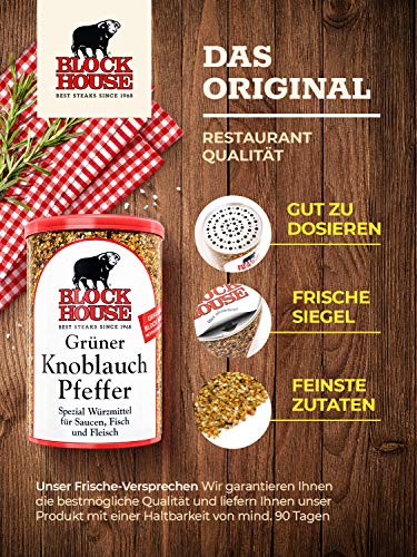 Große Packung des legendären Gewürzmix von Block House. Der Grüne Knoblauch Pfeffer von Block House genießt seit eh und je einen ausgezeichneten Ruf, da er hervorragend das Aroma von frisch gegrilltem Fleisch unterstützt und eine pikante Note verleiht. In ihm schlummert die unkopierbare Erfahrung von Block House, was exzellenten Steakgenuss betrifft.