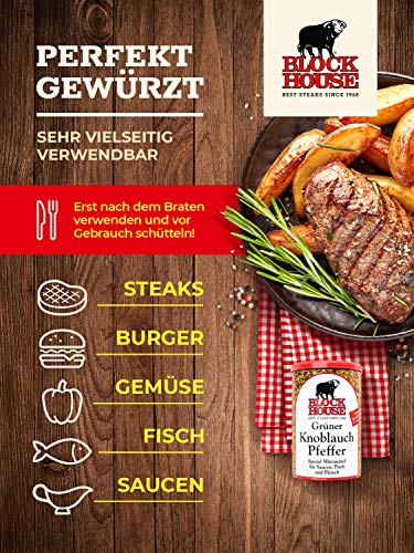 Block House Grüner Knoblauch Pfeffer 12x 200g geeignet für frisch gegrilltes Fleisch, Saucen aber auch Marinaden mit einem wunderbaren intensiven Geschmack.