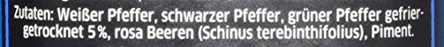 Zutaten: Pfeffer weiß, Pfeffer schwarz, Pfeffer grün gefriergetrocknet (5%), Rosa Beeren(Schinus terebinthifolius).