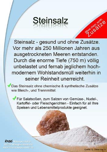 ✓ Speisesalz – das Steinsalz ohne chemische- synthetische Zusätze wie Bleich-, und Trennmittel.