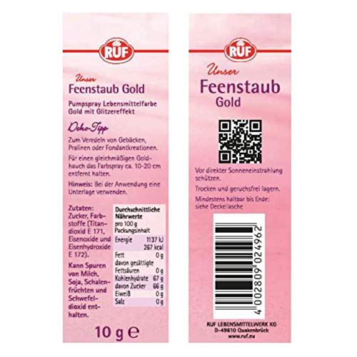 Specification: RUF Feenstaub Gold, goldener Dekoglitter, essbares Pumpspray für einen glänzenden Goldschimmer auf Fondant-Torten, Cup-Cakes und Desserts, 10g Flasche
