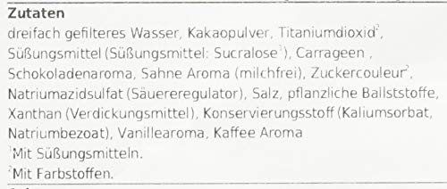 dreifach gefilteres Wasser, Kakaopulver, Titaniumdioxid, Süßungsmittel(Sucralose), Carrageen , Schokoladenaroma, Sahne Aroma (milchfrei), Zuckercouleur, NATRIUMAZIDSULFAT(Säuereregulator), Salz, pflanzliche Ballststoffe, Xanthan(Verdickungsmittel), Konservierungsstoff(Kaliumsorbat, Natriumbezoat), Vanillearoma, Kaffee Aroma