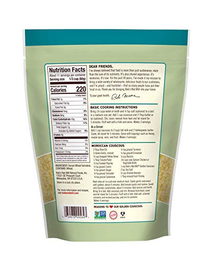 Bob’s Red Mill Couscous ist einfach vorgekochtes, grob gemahlenes Grieß (Endosperm von Durum Wheat), das eine hervorragende Beilage, ein Bett für Suppen und Eintöpfe oder eine Basis für Ihre Lieblings-Nudelsoße ist. Es ist auch ideal für Salate oder als Ersatz für Reis in Ihrem Lieblingsrezept. Es ist sehr schnell kochen, so dass es perfekt für ein einfaches Abendessen in der Woche ist. Siehe das Rezept auf der Verpackung für einen süßen Couscous, der als Dessert genossen werden kann.