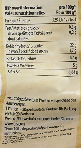 Zubereitung: 1. Packungsinhalt (548g) in eine Schüssel geben. 2. 1 Liter kochendes Wasser hinzugeben, umrühren und abdecken. 3. Ca. 15 Minuten ziehen lassen und mit einer Gabel auflockern. 4. Für eine optimale Zubereitung nach Belieben mit Salz, Olivenöl oder Kräuter abschmecken