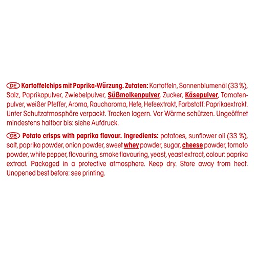 Zutaten: Kartoffeln, Sonnenblumenöl, Salz, Paprikapulver, Zwiebelpulver, SÜßMOLKENPULVER, Zucker, KÄSEPULVER, Tomatenpulver, weißer Pfeffer, Aroma, Raucharoma, Hefeextrakt, Farbstoff: Paprikaextrakt.