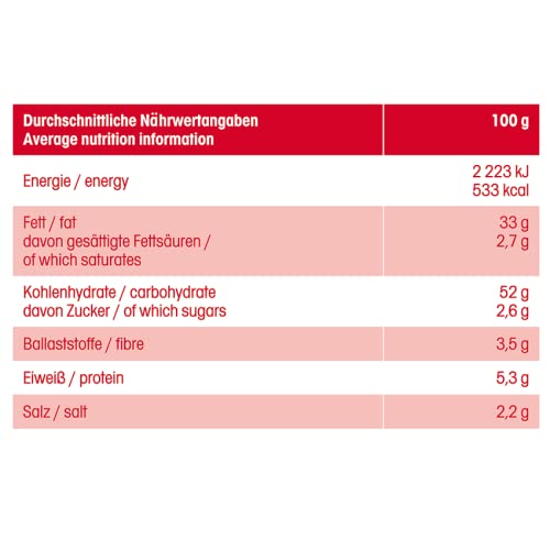 Zutaten: Kartoffeln, Sonnenblumenöl, Salz, Zucker, Zwiebelpulver, Paprikapulver, SAUERRAHMPULVER, Aroma (enthält MILCHERZEUGNISSE), Hefeextrakt, Farbstoff: Eisenoxide.