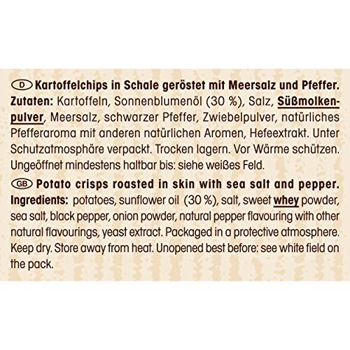 Zutaten: Kartoffeln, Sonnenblumenöl, Salz, SÜßMOLKENPULVER, Meersalz, schwarzer Pfeffer, Zwiebelpulver, natürliches Pfefferaroma mit anderen natürlichen Aromen, Hefeextrakt.