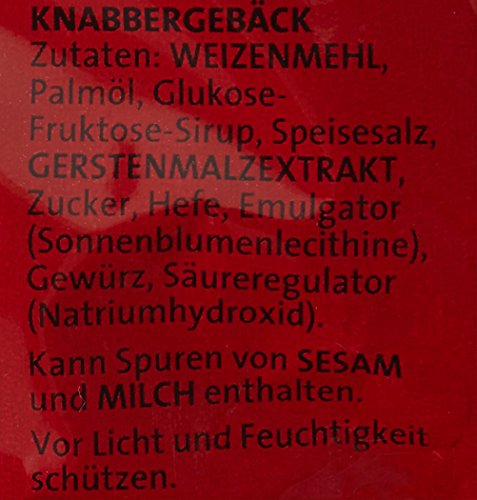 Zutaten: WEIZENMEHL, Palmöl, Glukose-Fruktose-Sirup, Speisesalz, GERSTENMALZEXTRAKT, Zucker, Hefe, Emulgator (Sonnenblumenlecithine), Gewürz, Säureregulator (Natriumhydroxid).Kann Spuren von SESAM und MILCH enthalten.