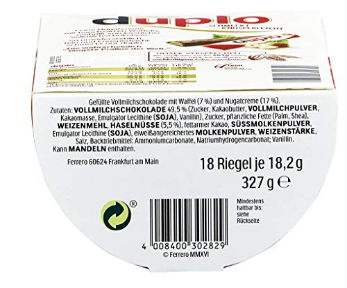 Lieferumfang: 18 Riegel Ferrero duplo je 18,2 g / Gefüllte Vollmilchschokolade mit Waffel (7 %) und Nugatcreme (17 %) / Vorratspackung zum Teilen