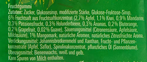 Glukosesirup, Zucker, modifizierte Stärke, 5 % Fruchtsaft aus Fruchtsaftkonzentrat, (aus 2,2 % Apfel, 0,9 % Kiwi, 0,8 % Mandarine, 0,3 % Ananas, 0,3 % Holunderbeere, 0,2 % Passionsfrucht, 0,2 % Blutorange, 0,1 % Grapefruit, 0,02 % Guave), Glukose-Fruktose-Sirup, Gelatine, Säuerungsmittel: Citronensäure, 1 % Mangomark, Frucht- und Pflanzenkonzentrate (Apfel, Saflor), natürliche Aromen, natürliches Grapefruit-Aroma, Spirulinakonzentrat, pflanzliches Öl (Sonnenblume), Überzugsmittel: Bienenwachs, weiß und gelb