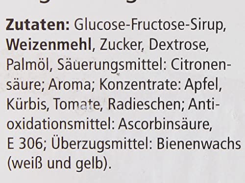 Glukose-Fruktose-Sirup, WEIZENMEHL, Zucker, Dektrose, pflanzliches Öl (Palmöl),Säuerungsmittel (Zitronensäure), Aroma, Antioxidationsmittel (Ascobinsäure), E306, Fruchtextrakt (Erdbeer), Farbstoffe (Kürbis, Tomate, Radieschen), Überzugsmittel Bienenwachs.