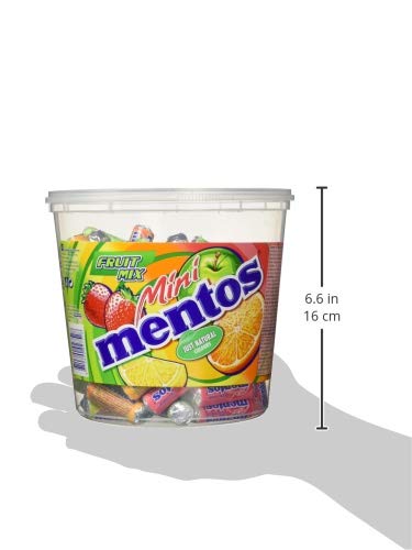 Specification: Mini Mentos Fruit Mix, Eimer mit 120 Rollen Kaubonbons, Box Frucht-Dragees, Geschmack Orange + Erbeere + Apfel + Zitrone