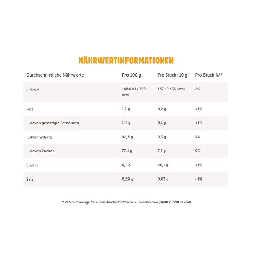 nimm2 Lolly Die nimm2 Lollys sind in den doppelten Geschmacksrichtungen besonders fruchtig und überzeugen mit einem lang anhaltenden Lutschspaß. Mit den Geschmacksrichtun- gen Orange-Zitrone, Apfel-Limette, Brombeere-Schwarze Johannisbeere und Kirsche-Himbeere ist für jeden Lutscher-Liebhaber der passende Lolly dabei. Sie sind nicht nur besonders lecker, sondern beinhalten Fruchtsaft und eine extra Portion Vitamine. Die Lollys sind zusätzlich einzeln verpackt, sodass sie auch unterwegs genascht wer- den können oder problem gelagert werden können, denn ein nimm2 passt zu jeder Gelegenheit. Zutaten Die Frucht-Lollys mit Vitaminen bestehen aus: Glukosesirup, Zucker, Säuerungsmittel Milchsäure, konzentrierte Fruchtsäfte 0,9% – entspricht 5% Fruchtsaft – (Apfel, Li- mette, Orange, Zitrone, Sauerkirsche, Himbeere, Schwarze Johannisbeere, Brombeere), Säureregulator Natriumlactat, Aromen, Vitamin C, Farbstoffe (Titandioxid, echtes Karmin, Paprikaextrakt, Kupferkomplexe der Chlorophylle und Chlorophylline, Pflanzenkohle), färbendes Schwarze Karottenkonzentrat, Niacin, Vitamin E, Vitamin B6, färbender Kurkuma-Auszug, Vitamin B12. nimm2 nimm2 ist ein leckeres Bonbon, das seit 1962 in Deutschland hergestellt wird. Der Name nimm2 entstand durch die Beutel, die mit den Bonbons aus zwei Geschmacks- richtungen Orange und Zitrone gefüllt sind. Sie verbinden Süßes mit einem Zusatz von Vitaminen. Heutzutage sind sie nicht nur als klassisches Bonbon gefüllt mit Orangen- und Zitronen-Geschmack erhältlich, sondern sind auch in den fruchtigen Produktvariatnen nimm2 soft, nimm2 Lachgummi, nimm2 Lolly und nimm2 zuckerfrei erhältlich. Inhaltsstoffe / Zutaten Zutaten: Glukosesirup, Zucker, Säuerungsmittel Milchsäure, konzentrierte Fruchtsäfte 0,9%* (Apfel, Limette, Orange, Zitrone, Sauerkirsche, Himbeere, Schwarze Johannisbeere, Brombeere), Säureregulator Natriumlactat, Aromen, Vitamin C, Farbstoffe (Titandioxid, Echtes Karmin, Paprikaextrakt, Kupferkomplexe der Chlorophylle und Chlorophylline , Pflanzenkohle), färbendes Schwarze Karottenkonzentrat, Niacin, Vitamin E, färbender Kurkuma-Auszug, Vitamin B6, Vitamin B12.#*entspricht 5% Fruchtsaft Gebrauchsanweisung Kühl und trocken lagern.