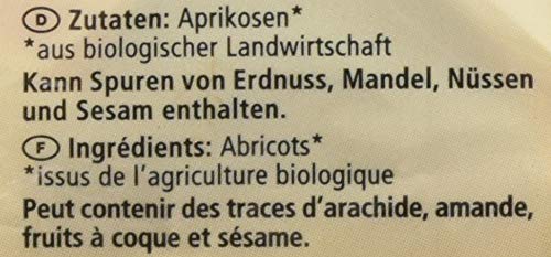 Aprikosen aus biologischer Landwirtschaft. Kann Spuren von Erdnuss, Mandel, Nüssen und Sesam enthalten.