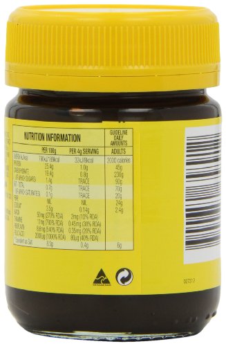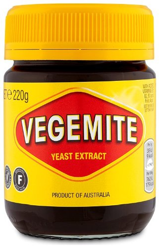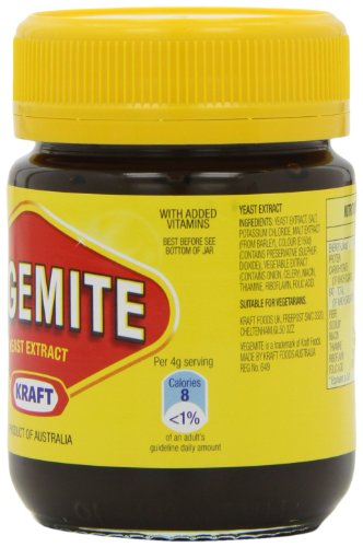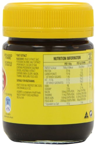 Concentrated yeast extract with added vitamins. The famous Vegemite spread proudly made in Australia since 1923. Spread on bread or toast for a delicious hearty snack. A source of Vitamin B. With added Vitamins B1, B2, B3 and Folic Acid. Suitable for vegetarians.