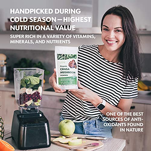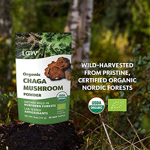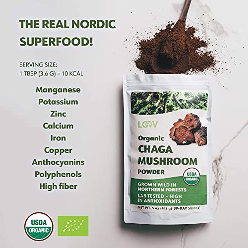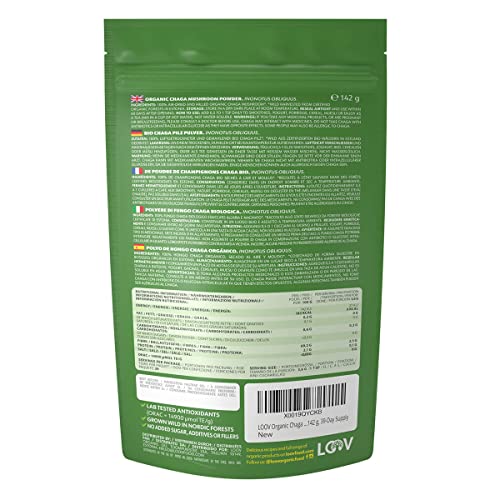 Specification: LOOV Bio Chaga-Pilzpulver, wild geerntet, nachhaltig in unberührten nordischen Wäldern angebaut, nicht kultiviert, ganzer roher Chaga, viele Antioxidantien, 142 g, Vorrat für 39 Tage